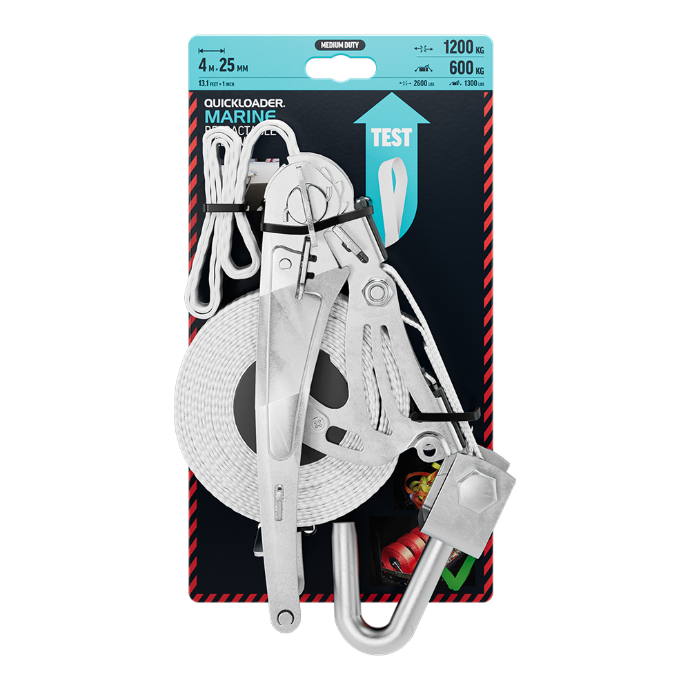 QUICKLOADER® Retractable Marine QL1200M tie-down secures your boat and prevents it from shifting and bouncing while transporting.